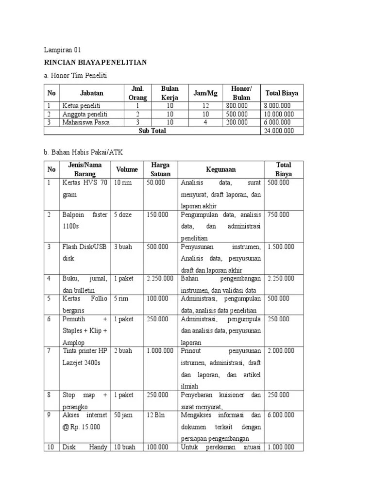 17, no, nama item, jenis kegiatan, volume, satuan, harga satuan (rp) . Proposal yang lolos seleksi wajib diterjemahkan dalam bahasa inggris. Anggaran penelitian berbasis standar biaya keluaran sub keluaran. Rincian anggaran biaya disertakan dalam proposal. Contoh penyusunan rencana anggaran biaya penelitian.